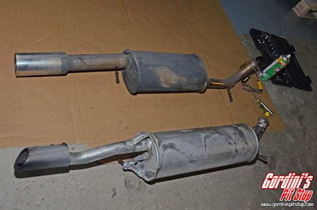 A couple of hours after getting it, I jacked Hagane up and got busy underneath. Changing the muffler is a relatively straightforward job, which consists in un-tightening the clamp linking the muffler to the pipe and sliding the exhaust out of the rubber support brackets. WD40 or any other lubricant is highly recommended there, and will make the job a breeze.